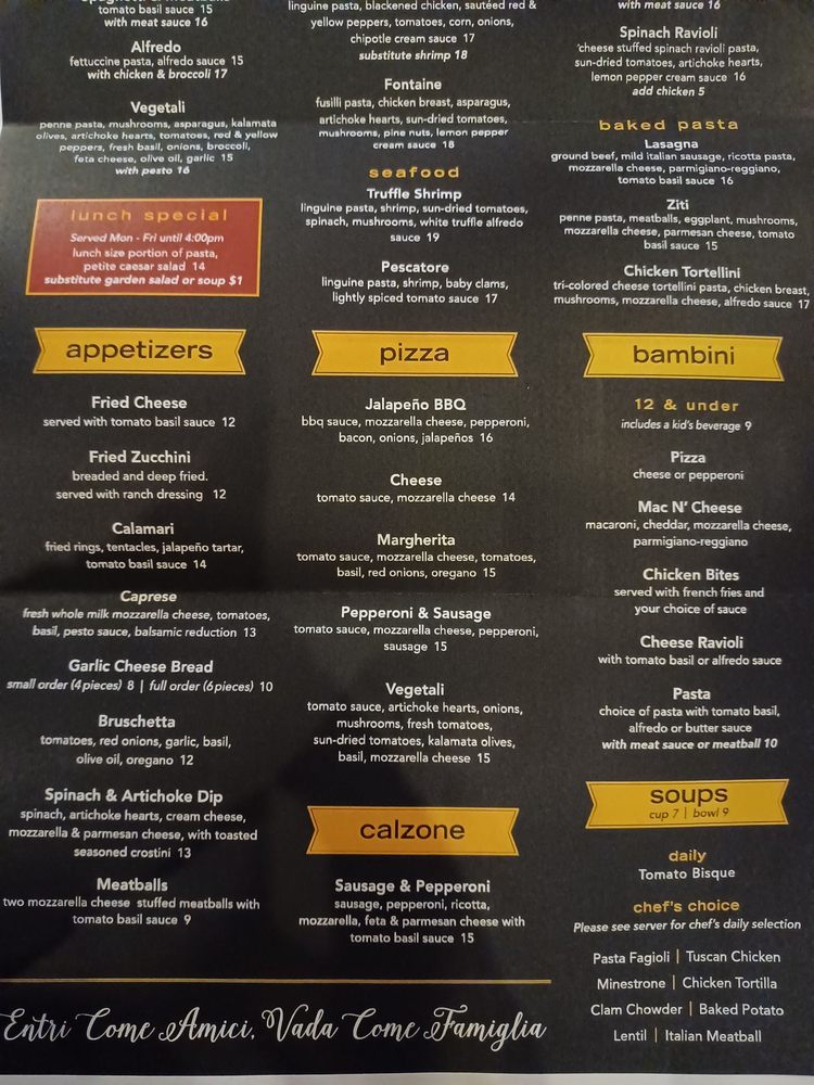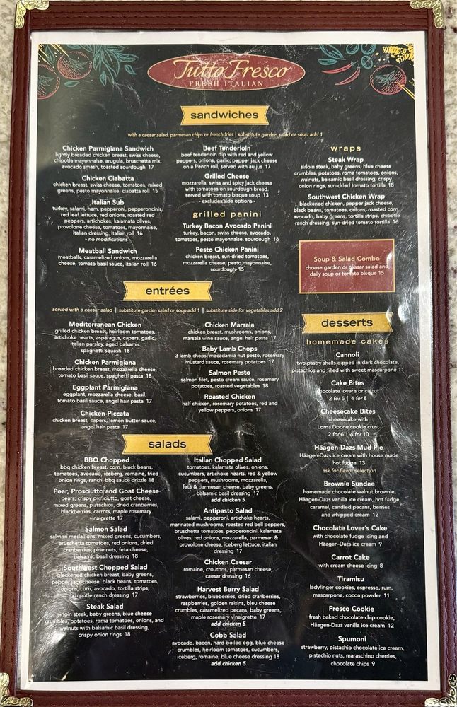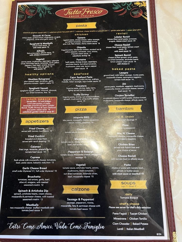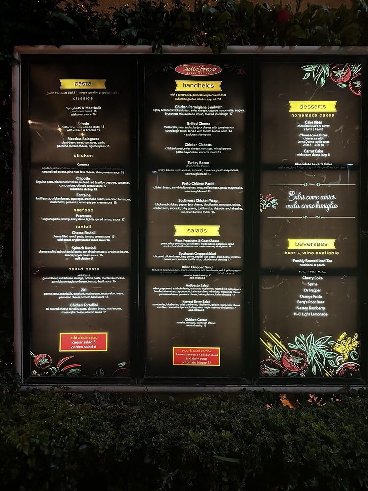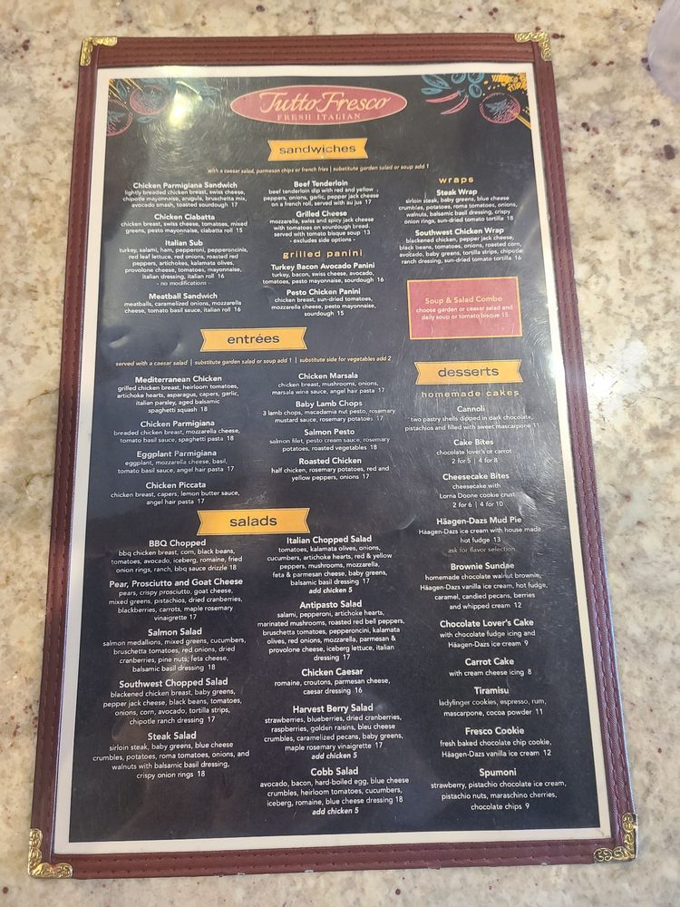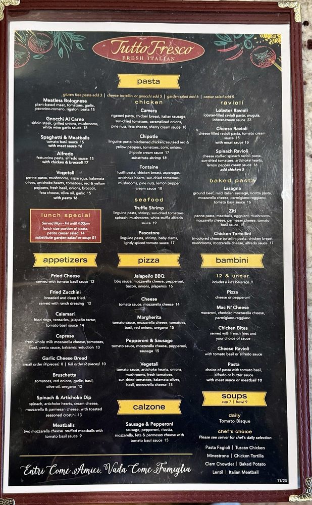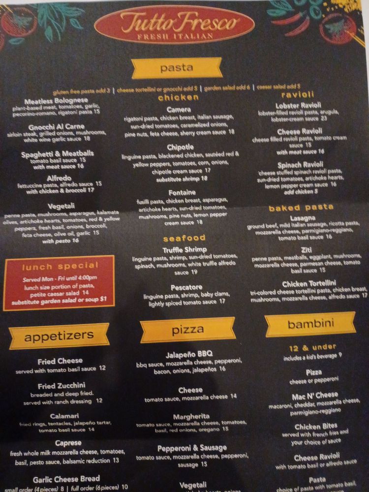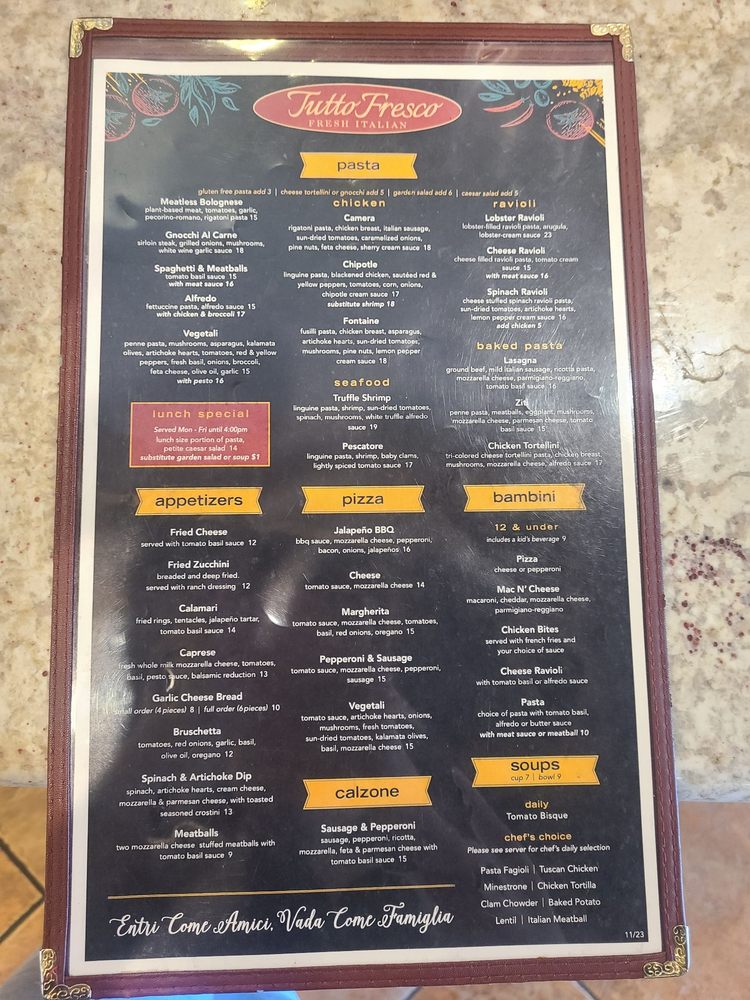 Introducing Tutto Fresco, an Italian restaurant located in Orange, CA. This cozy spot offers a variety of appetizers, salads, soups, and entrees that are sure to satisfy your cravings. The menu features dishes like Eggplant Rotolo, Calamari, Caprese salad, and Chicken Caesar salad. With options for vegans and vegetarians, Tutto Fresco caters to a diverse range of dietary preferences.